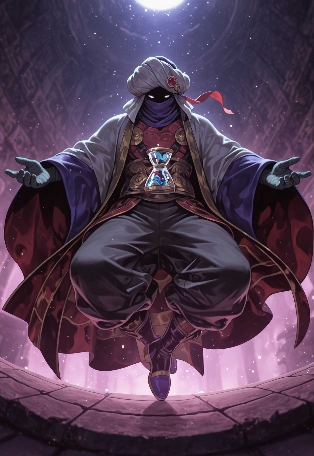 Pony tags: resh'an, 1boy, solo, full body, turban, faceless, white eyes, cloak, hourglass, bandages, baggy pants, boots
