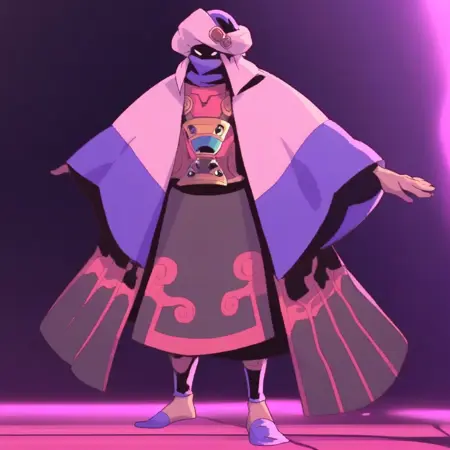 Illustrious tags: resh'an, solo, full body, 1boy, colored skin, turban, faceless, white eyes, cloak, robe, hourglass, bandages, baggy pants, boots