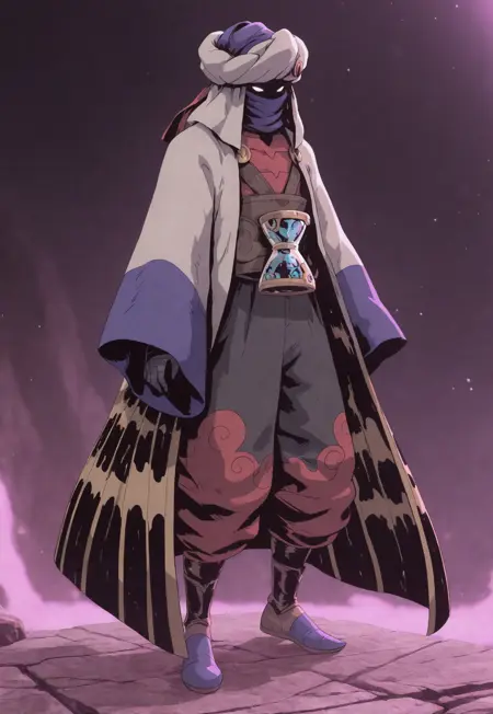 포니 태그: resh'an, 1boy, solo, full body, turban, faceless, white eyes, cloak, hourglass, bandages, baggy pants, boots
