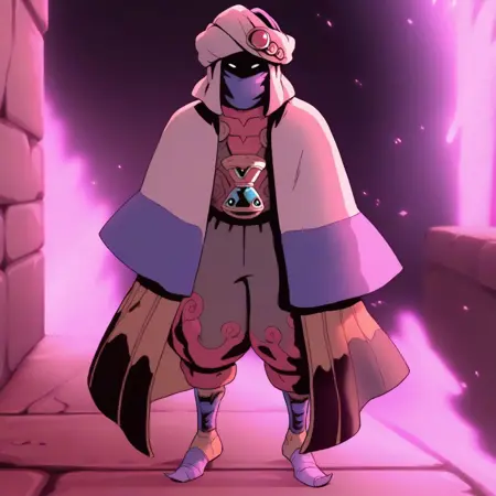 注目タグ:resh'an、ソロ、全身、1人男の子、色付き肌、ターバン、無顔、白い目、マント、ローブ、砂時計、包帯、ゆったりしたズボン、ブーツ
