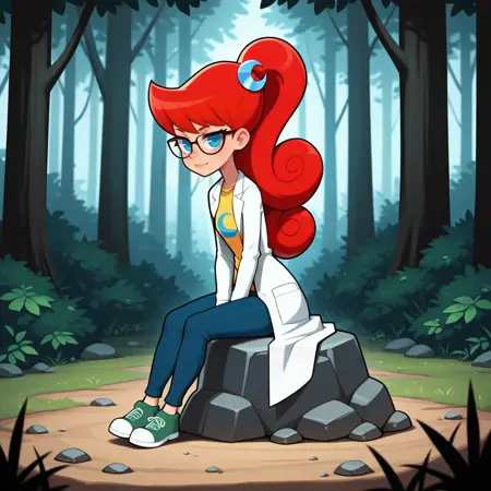 MaryTest, 1girl, solo, Red hair, long hair, high ponytail , blue eyes, glasses, hair ornament,