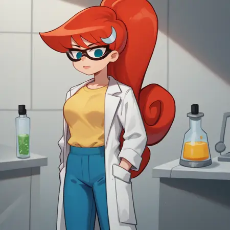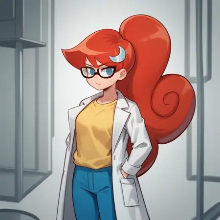 1girl, Mary, Red hair, long hair, high ponytail , blue eyes, glasses, blue pants , yellow t-shirt, crescent hair ornament , lab coat, long sleeves,