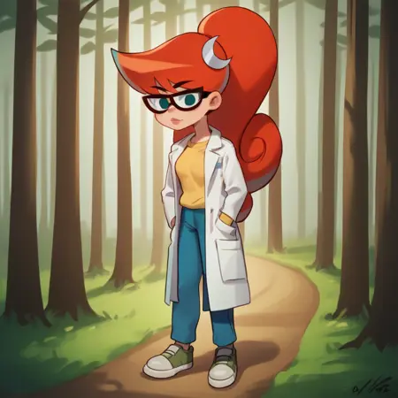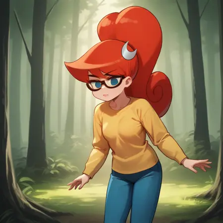 1girl, Mary, Red hair, long hair, high ponytail , blue eyes, glasses, blue pants , yellow t-shirt, crescent hair ornament , lab coat, long sleeves,