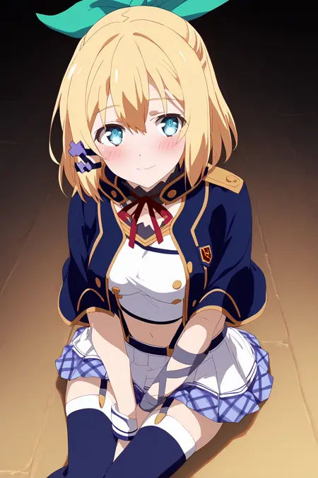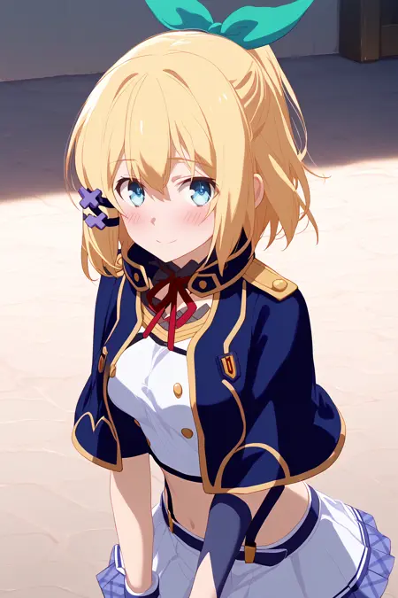 alzano school uniform, blue capelet, blue thighhighs, neck ribbon, detached collar, garter straps, single wrist cuff, single glove, uneven gloves, shirt, pleated skirt, suspender skirt, midriff,