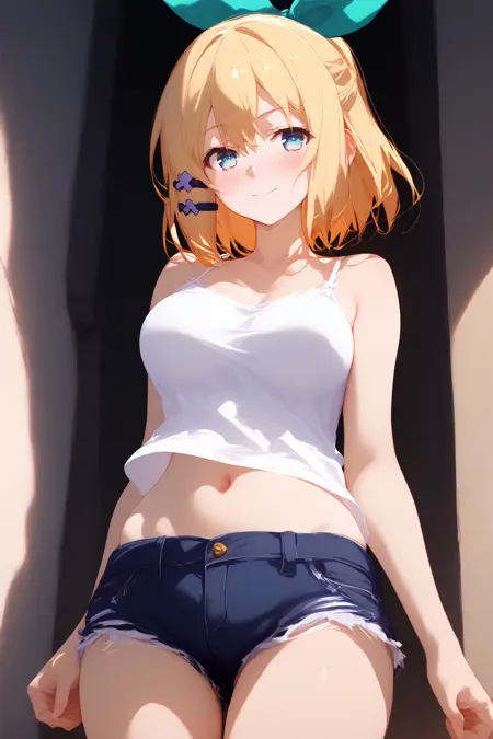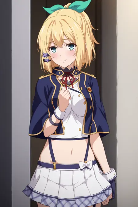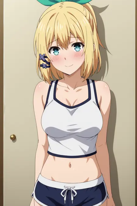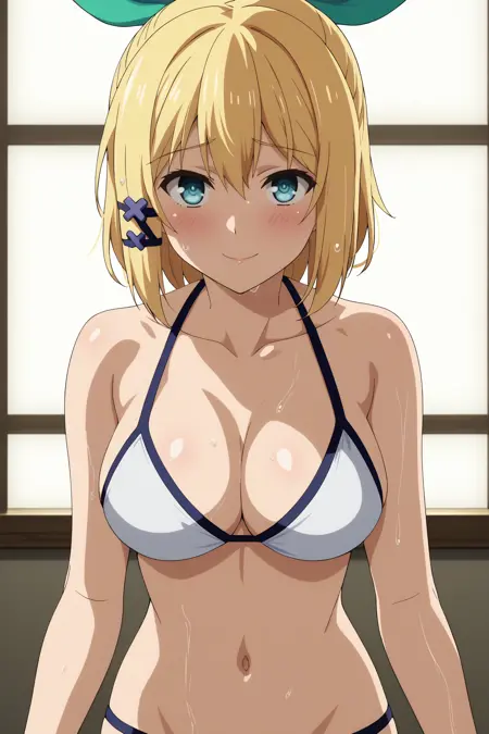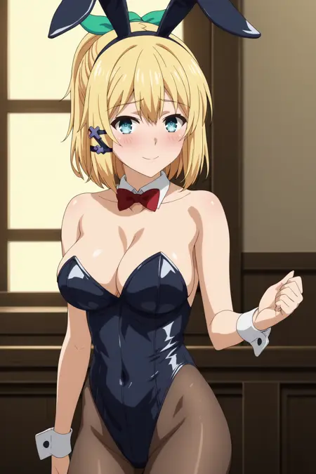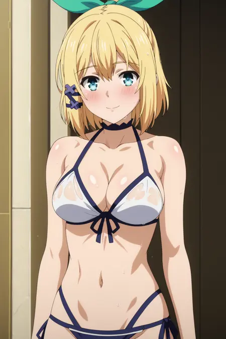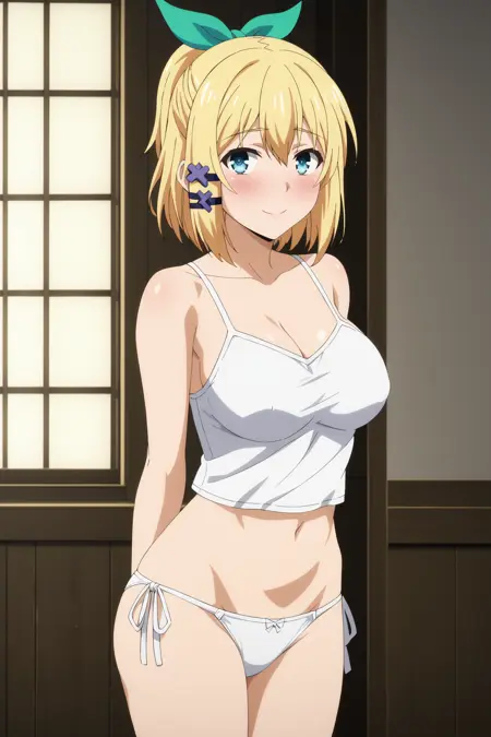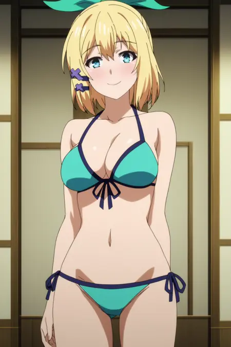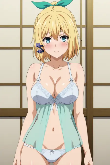 1girl, rumia tingel, rokudenashi majutsu koushi to akashic record, blue eyes, blonde hair, short hair, ponytail, hair clip, large breasts, green ribbon,