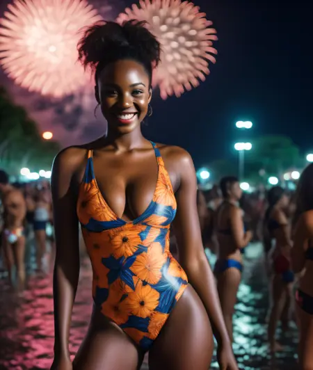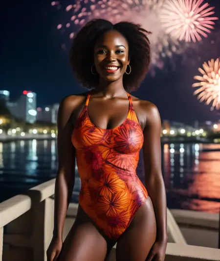 ワンピース水着、笑顔のアフリカ系女性の写真、オレンジのストライプが入った肌にぴったり合う青い模様のワンピース水着を着て街を歩き、バストライン、幸せ、セクシーに誘い、中程度のバスト
