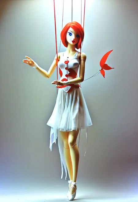 marionetka, a puppet in a red and black dress