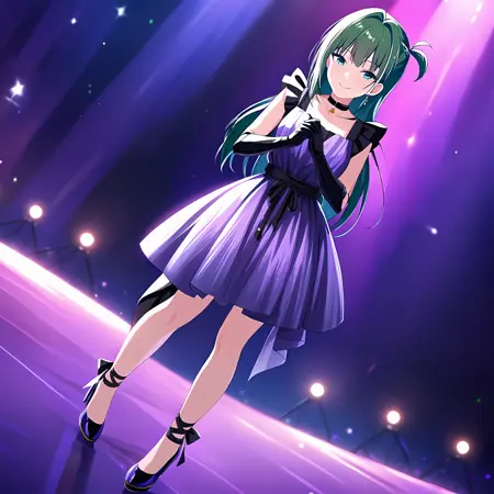 1girl, komiyama2, one side up, long hair, komiyidoly2 dress, komiyidoly2 earrings, komiyidoly2 elbow gloves, komiyidoly2 choker, komiyidoly2 high heels, hair ornament,