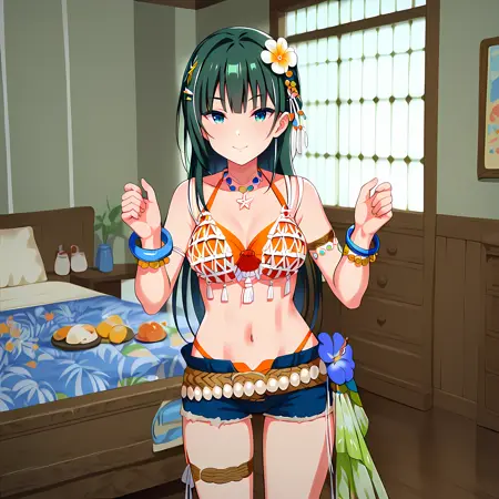 komiyama2, long hair, one side up, komiydsw4 cutoffs, komiydsw4 hair ornament, komiydsw4 bracelet, komiydsw4 bikini, komiydsw4 belt, komiydsw4 thigh strap, kysw4 necklace, komiydsw4 sandals,