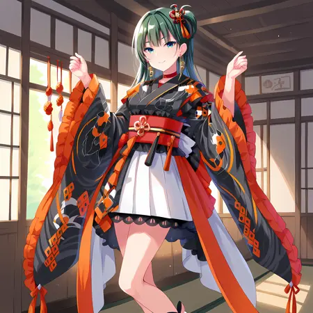 komiyama2, komiya5 kimono, komiya5 choker, komiya5 skirt, komiya5 hair ornament, komiya5 sandals, komiya5 obi, komiya5 earrings, one side up, long hair,