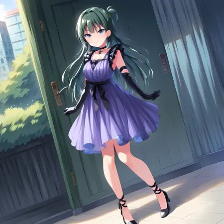 1girl, komiyama2, one side up, long hair, komiyidoly2 dress, komiyidoly2 earrings, komiyidoly2 elbow gloves, komiyidoly2 choker, komiyidoly2 high heels, hair ornament,