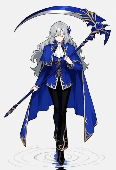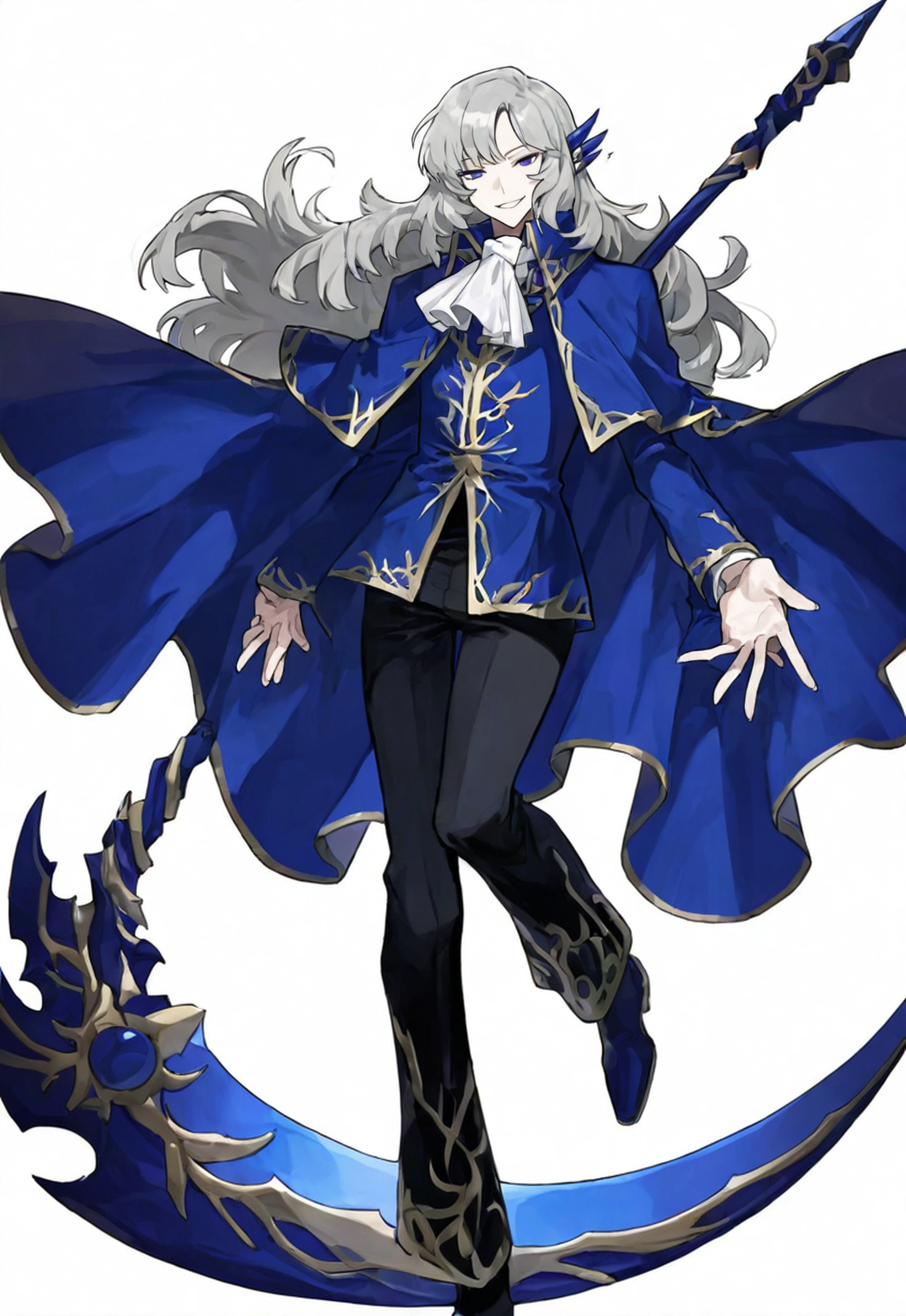black pants, blue jacket, blue cape, black footwear