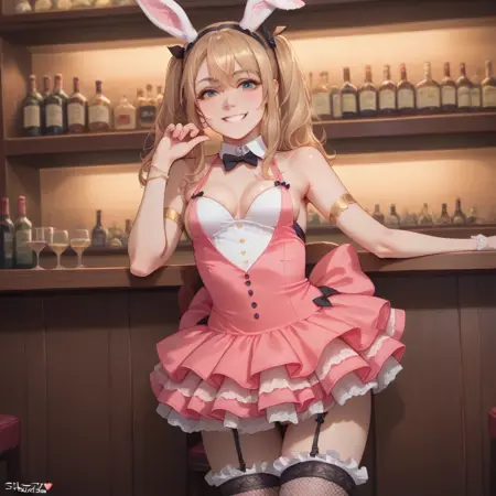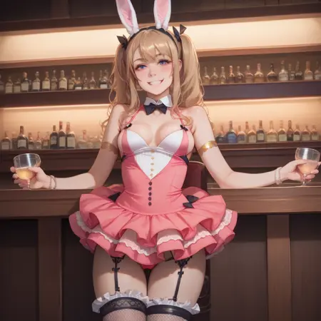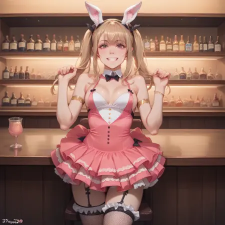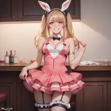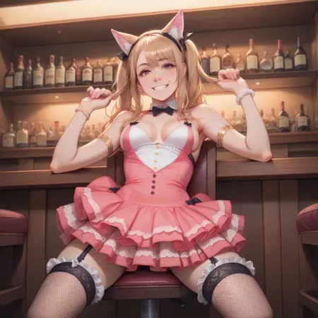 트리거 스크립트는"mikokurokawa, blonde hair, twintails, animal ears, fishnet thighhighs, garter straps, pink dress"