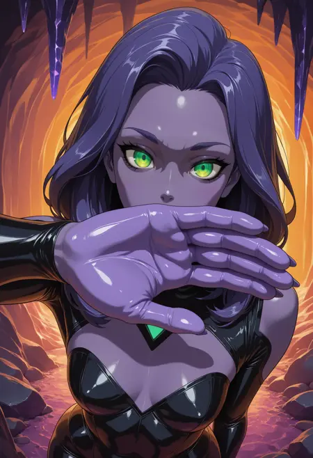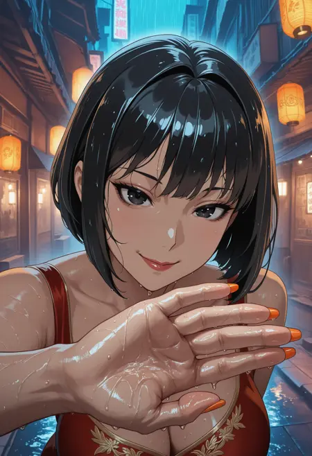 完整提示示例: hand palm, left_hand, (cupping, focused_hand, fingerprints), 黑发, 哥特风, BDSM房间, 浓妆, 低角度, 比嘘的手势, 深蓝眼睛, 暗色妆容, 朋克美学, 红色背光, 硬阴影, 黑色长袍, 单枚戒指, 大戒指, 柔软皮肤褶皱, 刘海, 红色指甲, 短指甲, [wide-shot]