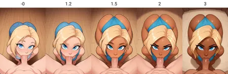 このスライダーは、高いまたは低い重みを使わない限り生成にほとんど影響を与えませんが、ほとんどの使用ケースでは -0.3 から 1 で十分だと感じました。SDXLでも動作しますが、より高い重みが必要です。