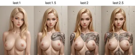 タトゥーを追加するスライダーは、約0.9で小さなタトゥーの生成を開始し、徐々に増加して約3まで達します。その後、画像が変化し始めます。これはこのモデルが学習されたCyberRealistic Ponyでの挙動です。私のインストール済みのPonyチェックポイントの中でも、最も多様で詳細なタトゥーが得られました。