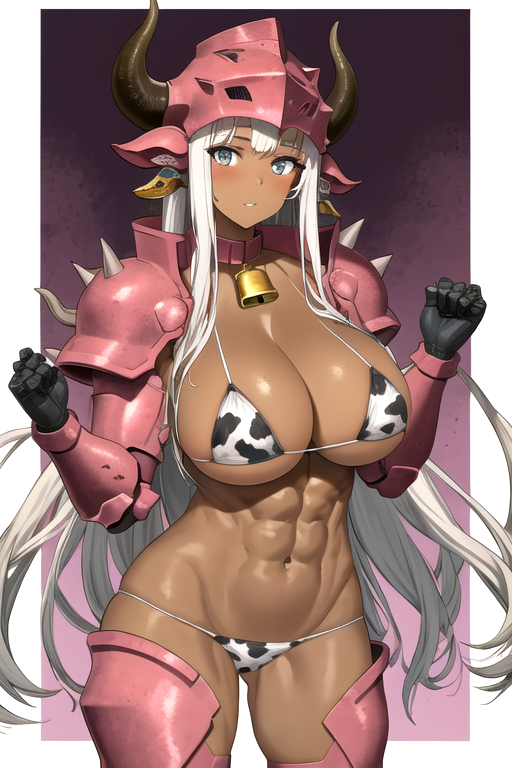 | トレーニングワード | Asterios12B3ast, 1girl, solo, long hair, huge breasts, thighhighs, navel, cow ears, cleavage, white hair, micro bikini, cow horns, dark skin, pink armor, dark-skinned female, neck bell, muscular, abs, horned helmet, cow print, shoulder armor, gauntlets, spikes, pauldrons, fake horns, bikini armor, cow girl, コピーしました! |
