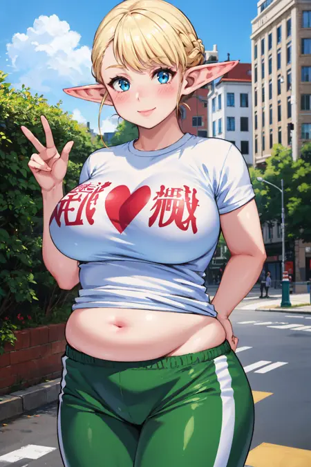 彼女の典型的な外見には、「白いTシャツ、服に文字、緑のズボン、トレーニングパンツ、お腹」を追加してください。