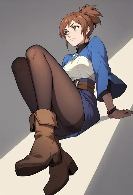 Trigger Word (Outfit): grey pantyhose, short dress, grey dress, blue sleeves, long sleeves, brown belt, brown boots, socks