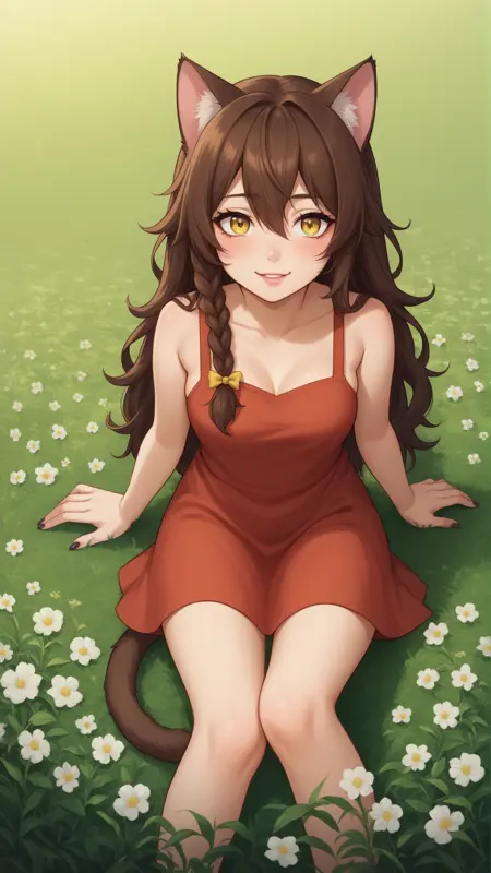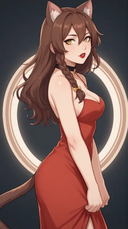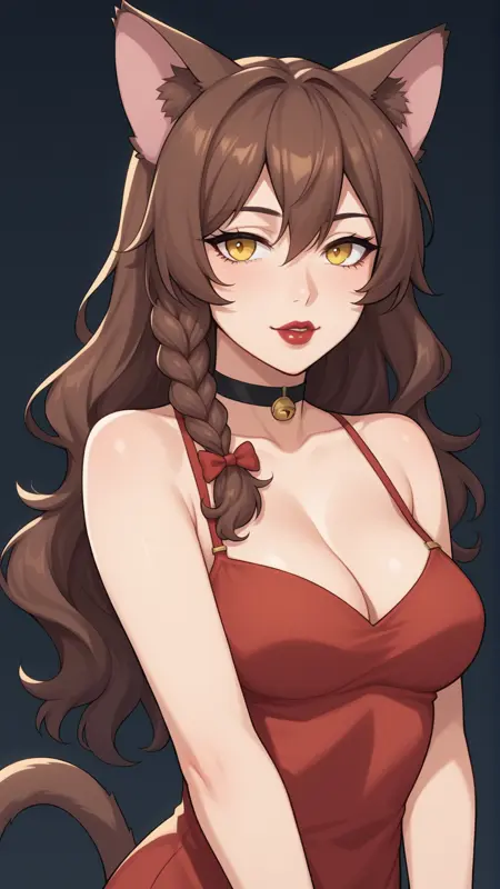 yulya、茶色の髪、黄色い目、目の間の髪、猫の瞳、動物の耳、猫の耳、尾、猫の尾、猫娘、長い髪、編み込み、片側編み込み、単一編み込み、リボン、1girl、シングル、赤いドレス