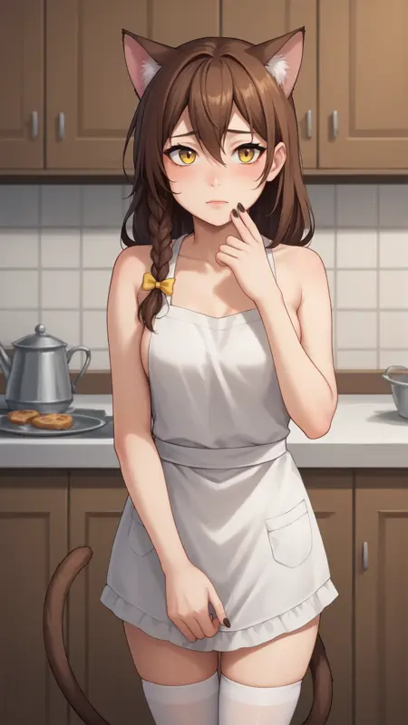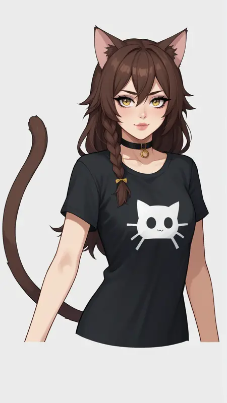 yulya、長い髪、茶色の髪、編み込み、片側編み込み、単一編み込み、動物の耳、猫の耳、黄色い目、尾、猫の尾、中くらいの胸、猫娘