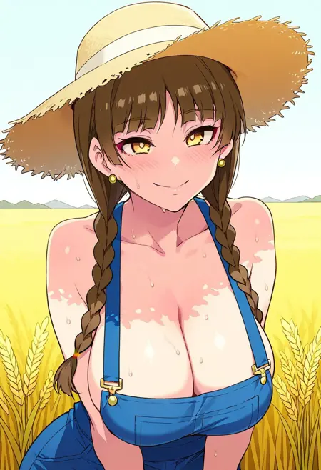 (( lora:shimazu\_yoshino:1 , shimazu_yoshino, thin waist, wide hips, beautiful skin, piercing yellow eyes, clear eyes, bright pupils, beautiful eyes, beautiful brown hair, beautiful long hair, double braids, braids over shoulder, bangs, huge and shaggy breasts, natural beauty, extraordinary beautiful woman, attractive woman, super sexy woman, lustful body, sexy woman with seductive obscene body, sensual body, voluptuous body, sexy beauty, no piercings, no piercing, ))