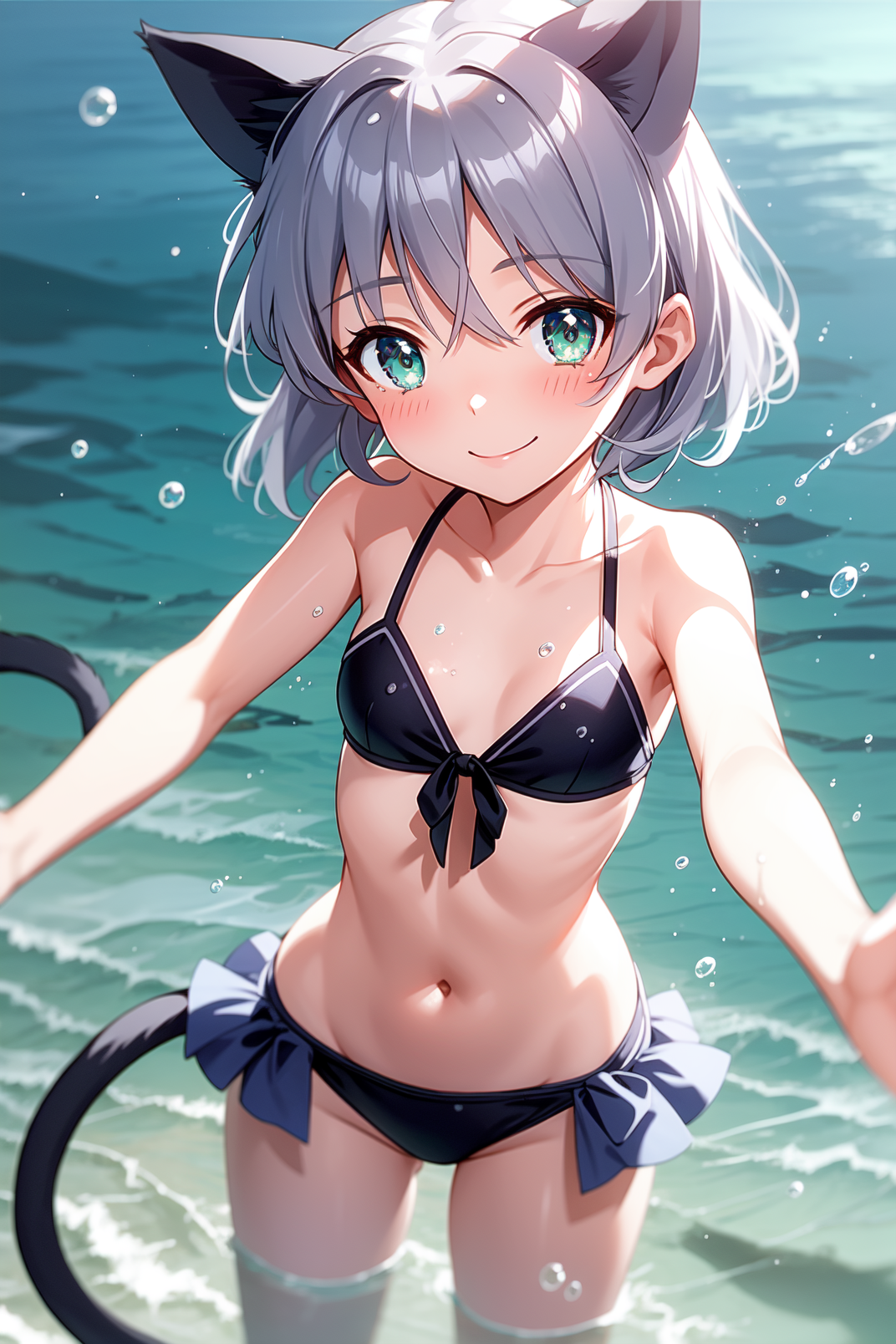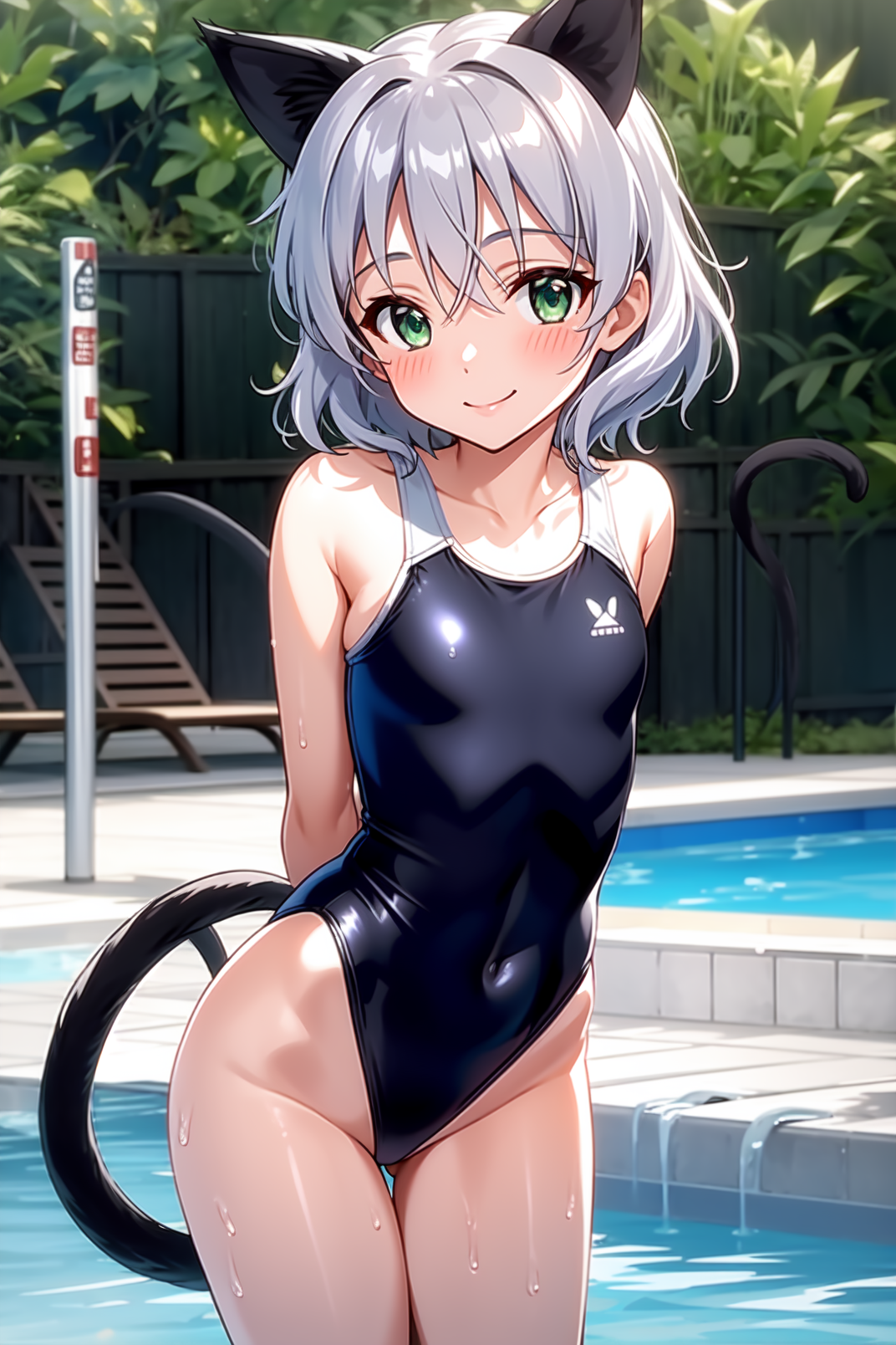外观:三亚,绿色眼睛,灰色头发,短发,猫耳,猫尾