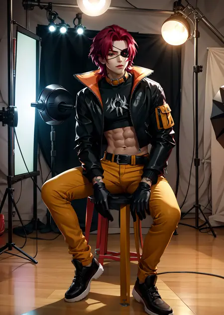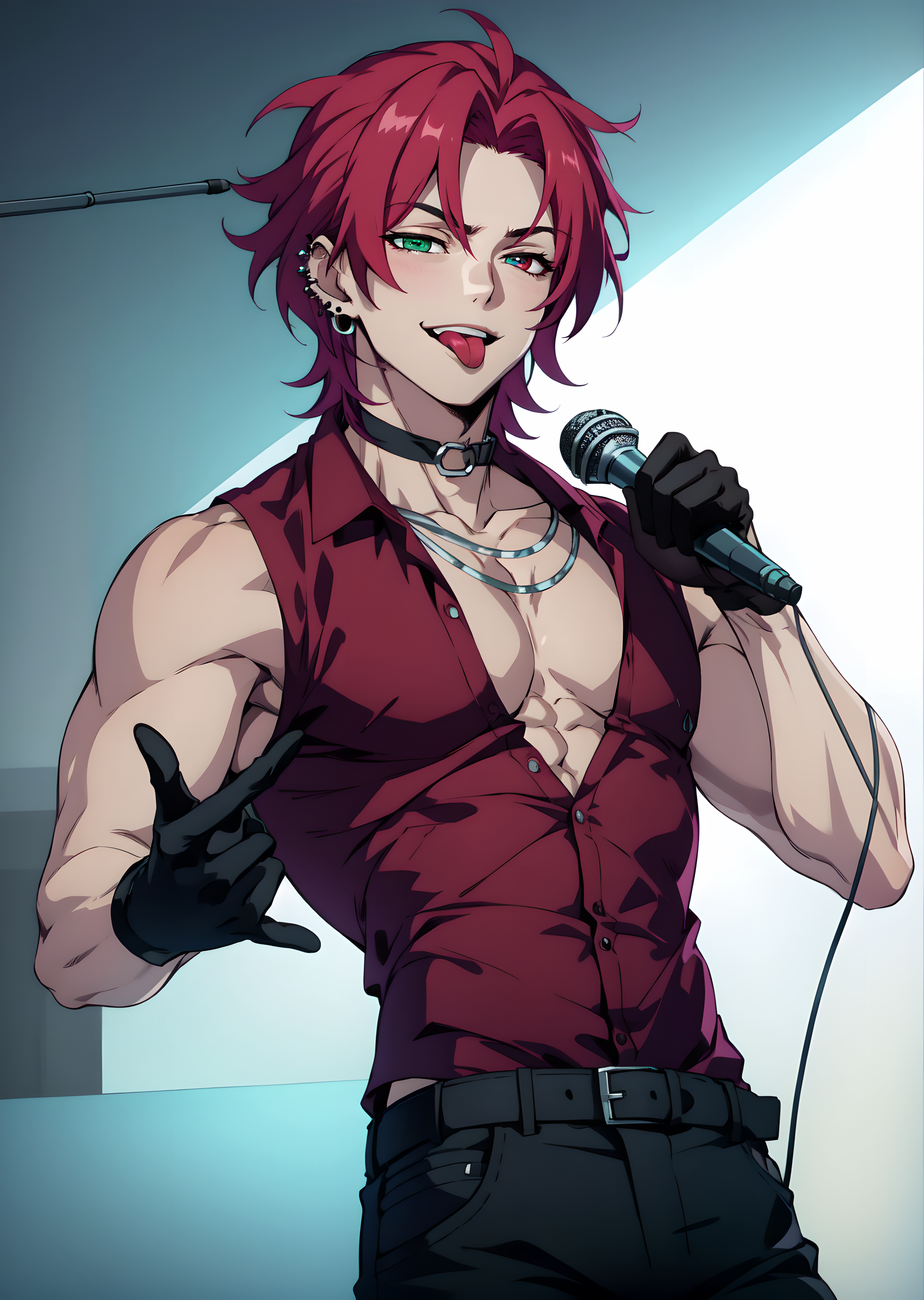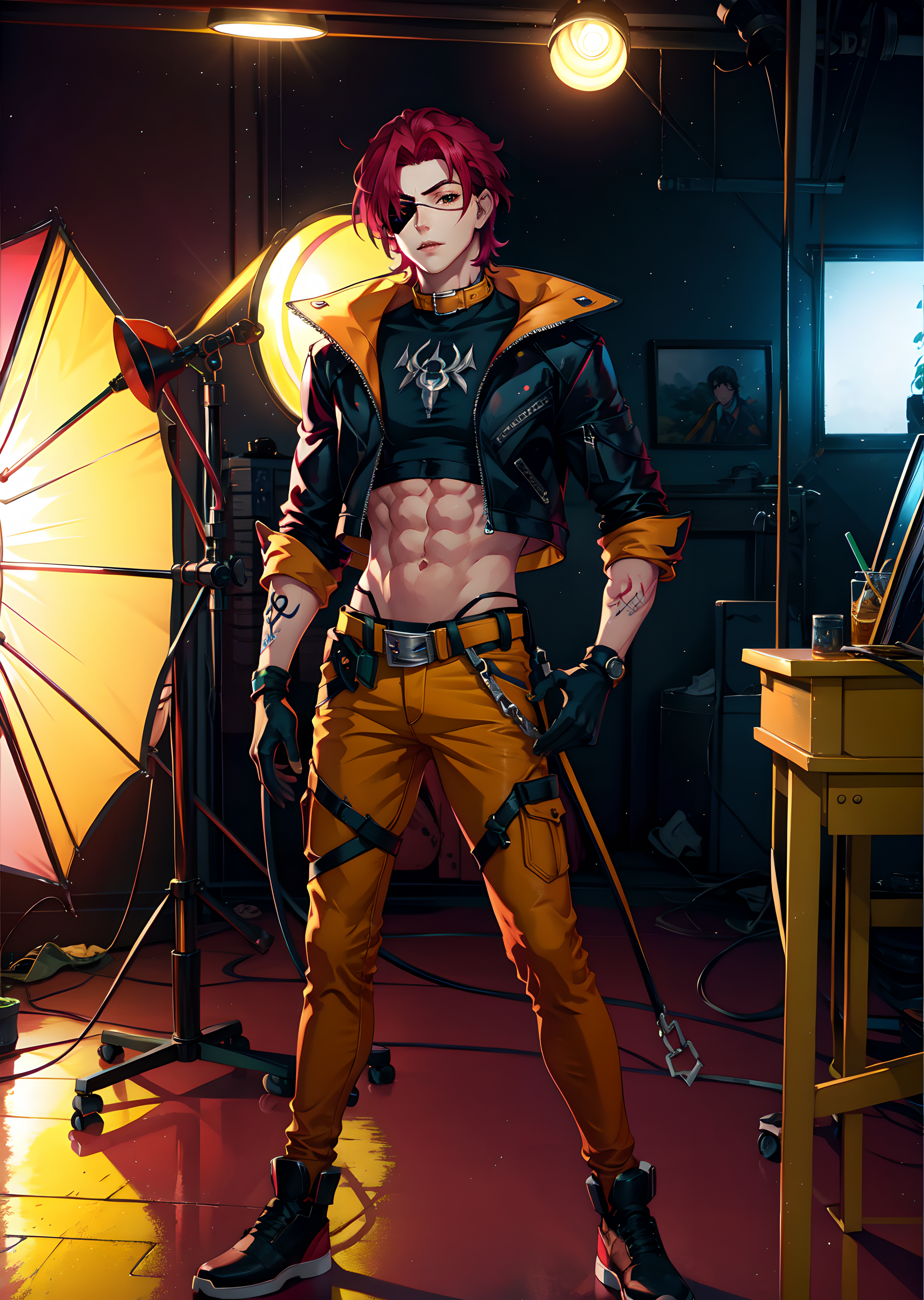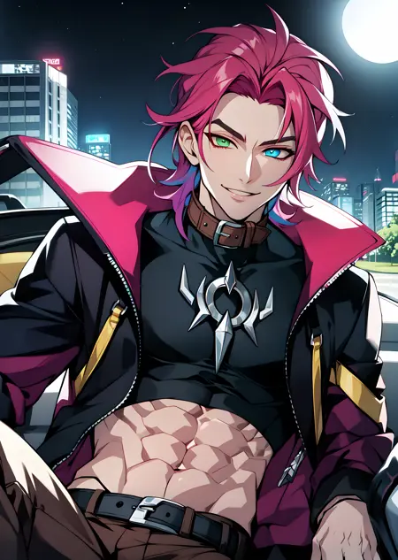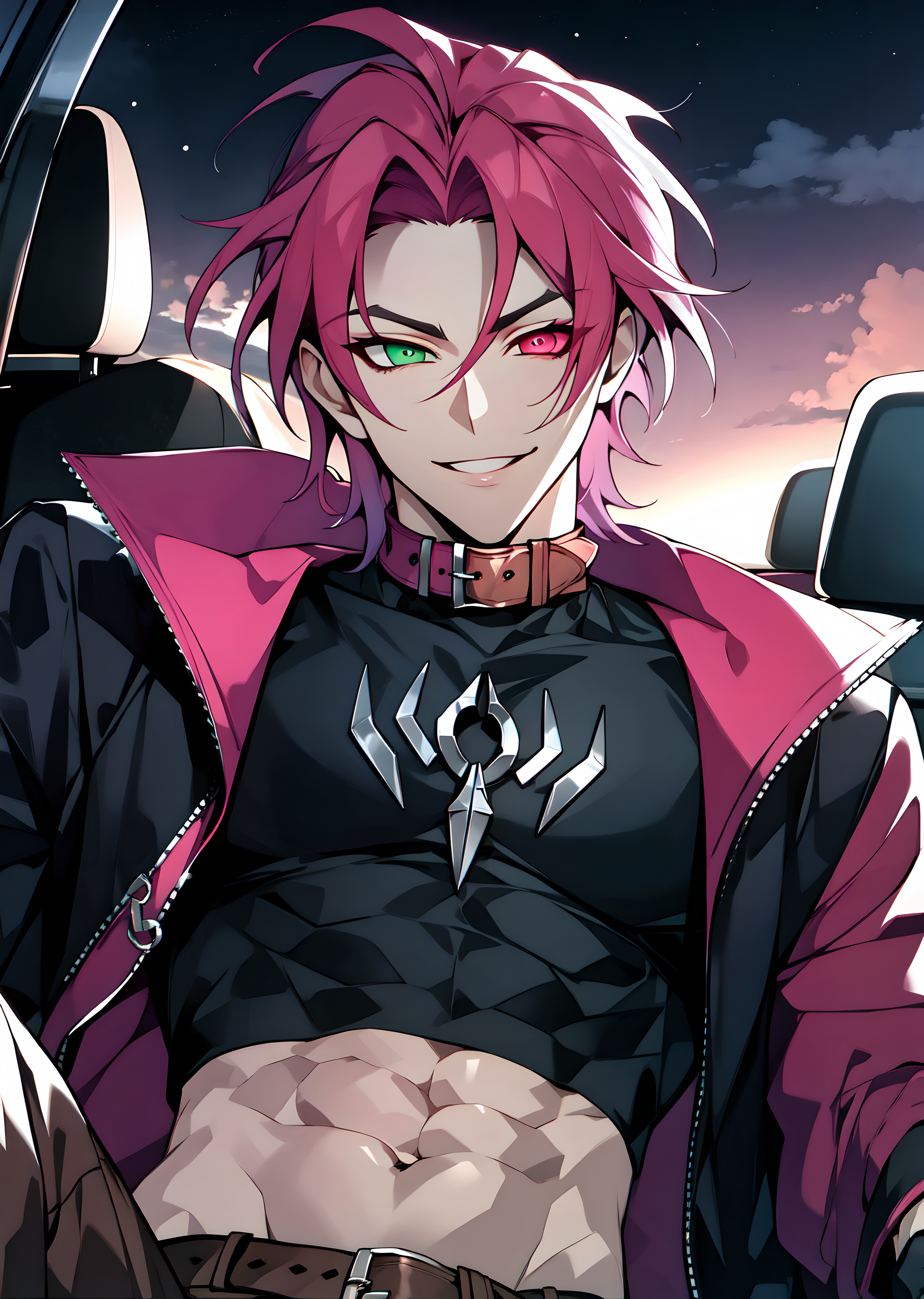 hskayn, solo, looking at viewer, 1boy, pink hair, male focus, heterochromia, smile, gloves, green eyes, jacket, open clothes, black gloves, midriff, belt, pants, fingerless gloves, open jacket, black jacket, crop top, abs, single glove, brown pants, collar