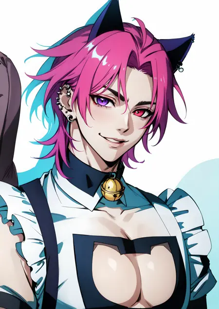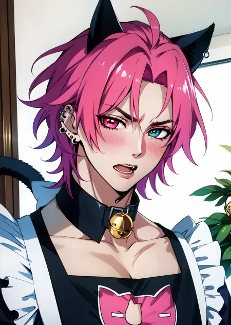 fake animal ears, cat cutout, cat lingerie, jingle bell, neck bell, maid apron, crossdressing, enmaided, meme attire, pectoral cleavage, cat cutout, cat lingerie, cat boy