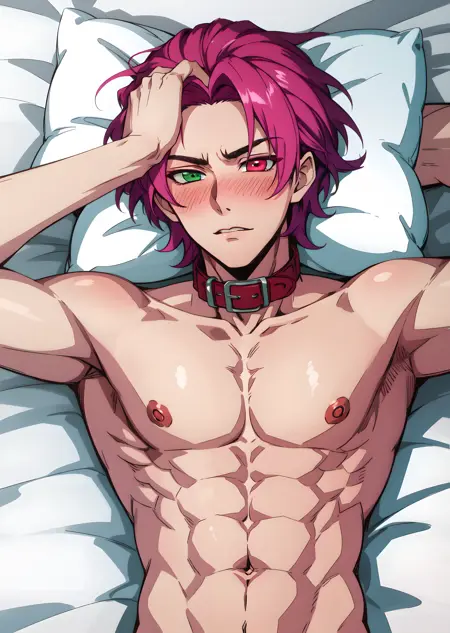 hskayn, solo, looking at viewer, shirt, 1boy, jewelry, pink hair, purple hair, male focus, earrings, collared shirt, pants, necklace, bracelet, black shirt, heterochromia, scar, ring, pectorals, watch, wristwatch