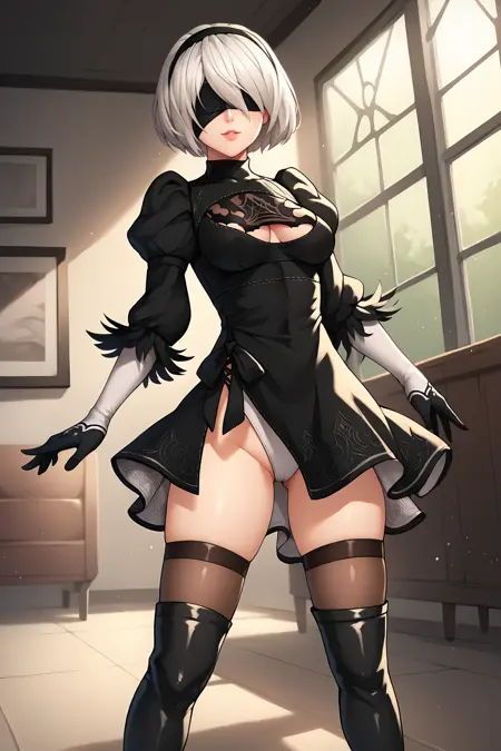 ➜ 2BNAXL、目隠し、黒い目隠し、ヘアバンド、白い髪、短髪、中程度の胸、衣装カットアウト、胸元カットアウト、黒いドレス、ふわふわの袖、羽飾り付き袖、黒い手袋、レオタード、スカート、黒い太ももハイ、太ももブーツ、黒いハイヒール