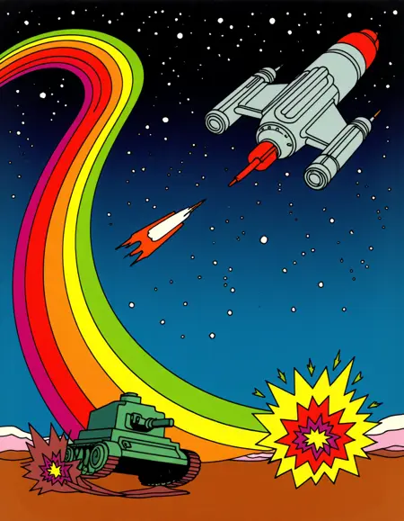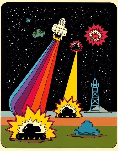 우주선이 다른 우주선을 공격하며 주변에 주황색 소행성과 색색의 나선형 트레일이 있는 게임 커버, vintage-activision 스타일로