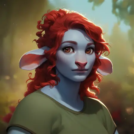 예시 프롬프트: firbolg, furry, animal nose and ears, tail, tail tuft, 1girl, blue skin, red hair, brown eyes