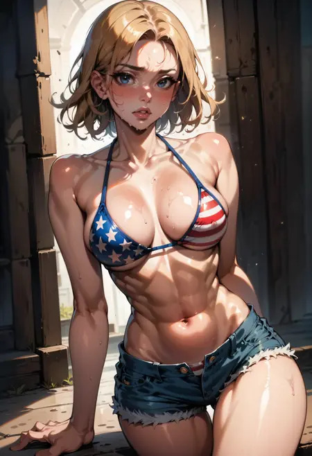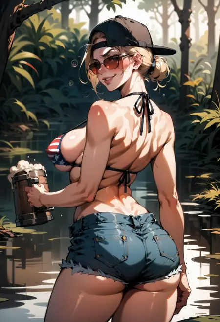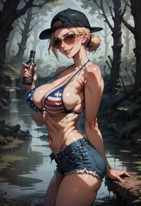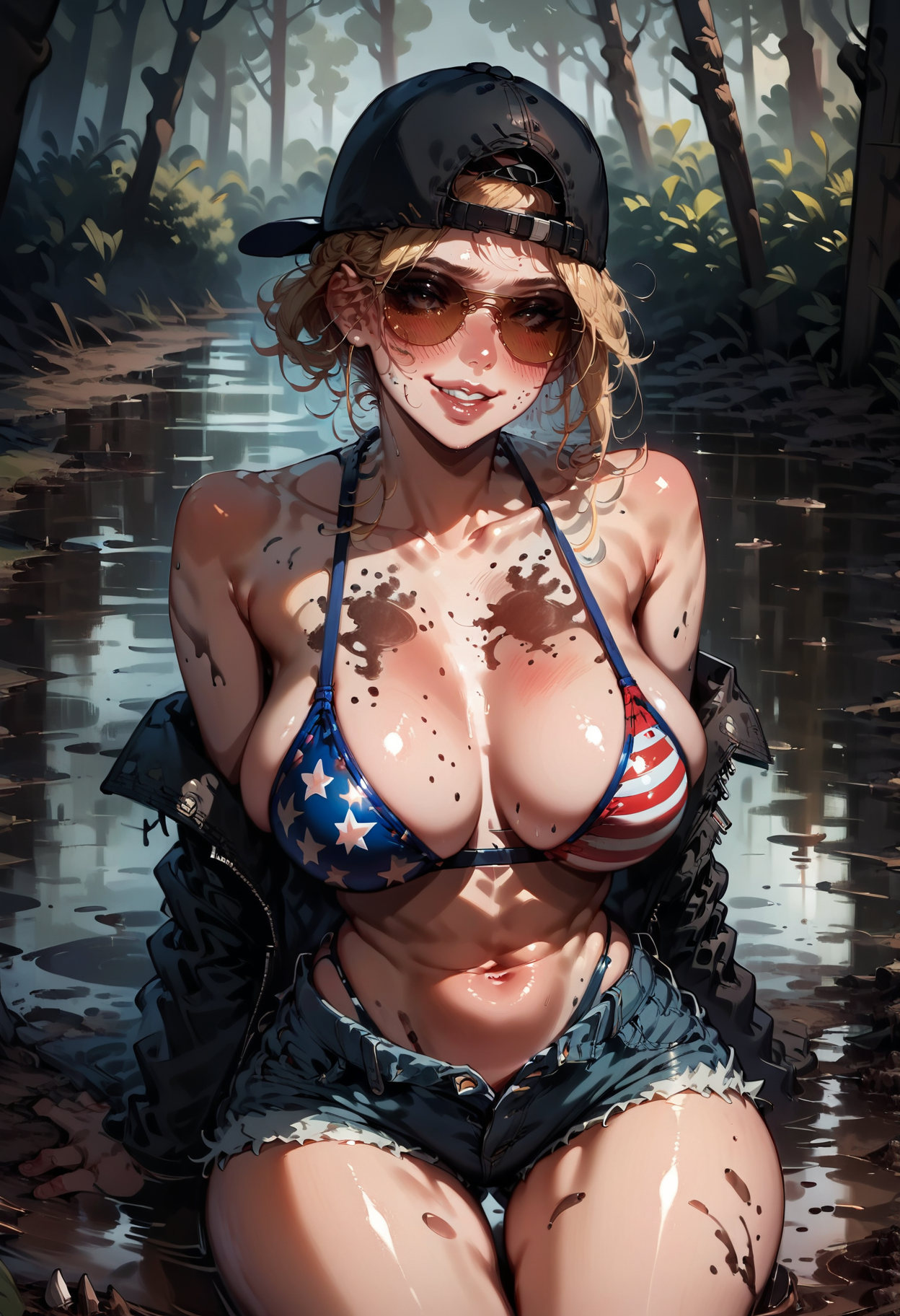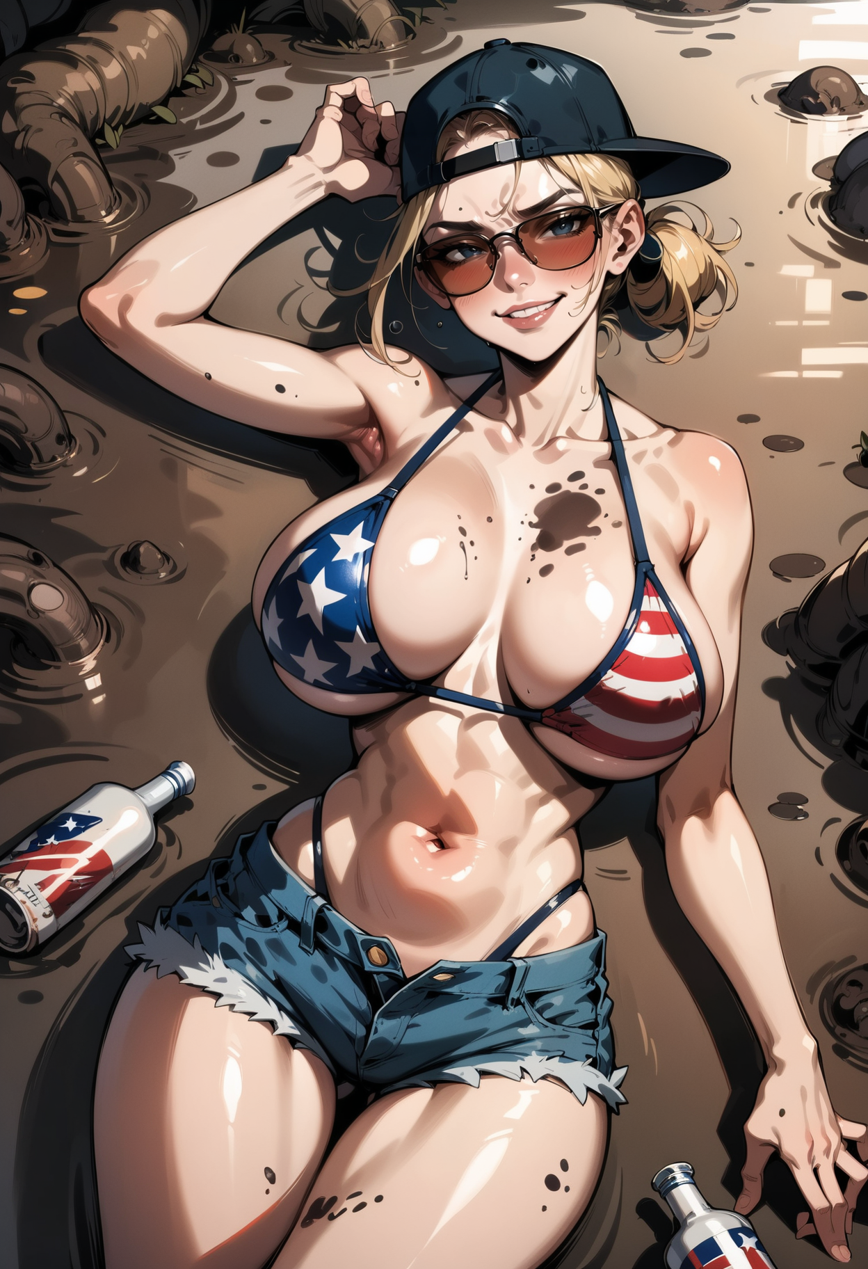触发词: mudg1rl, 1girl, 棒球帽, 帽子戴反, 太阳镜, 美国国旗比基尼, 牛仔短裤