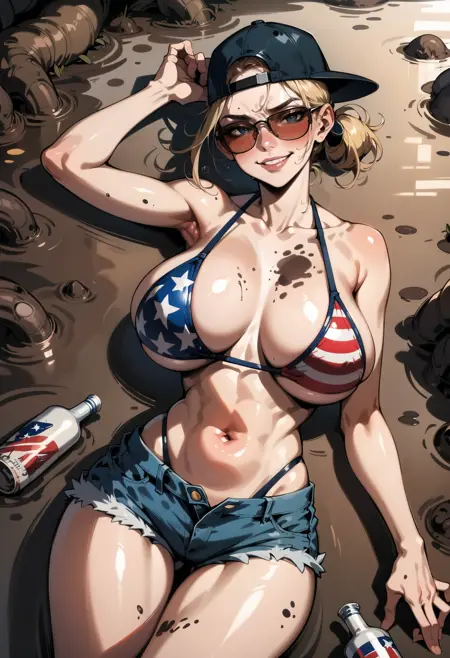 トリガー語: mudg1rl, 1girl, ベースボールキャップ, 後ろ向きの帽子, サングラス, アメリカ国旗のビキニ、デニムショートパンツ