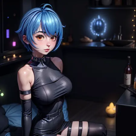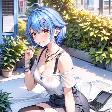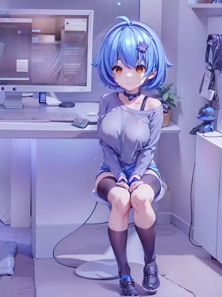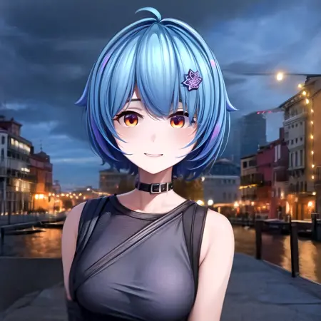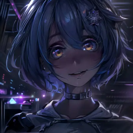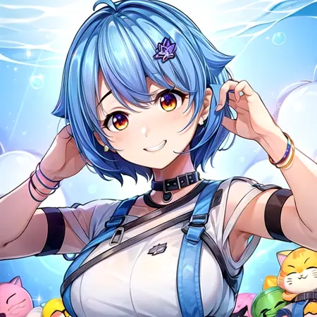 正面提示:虚拟主播,蓝发,短发,橙色眼睛,1个女孩,单人