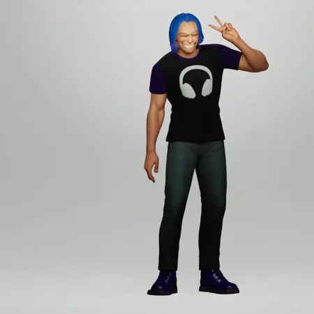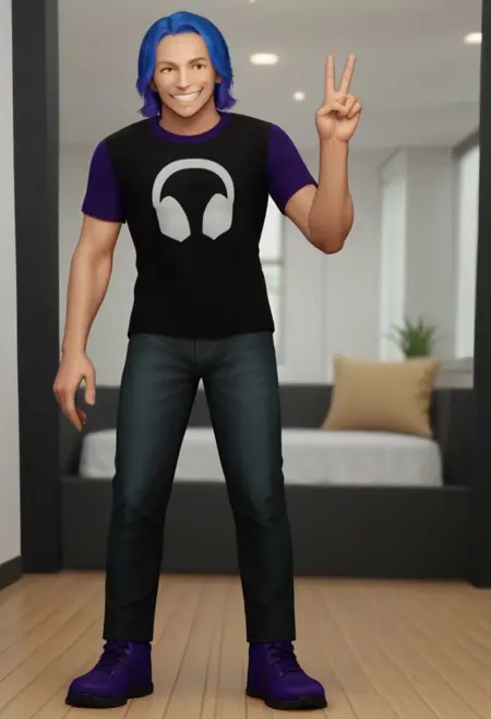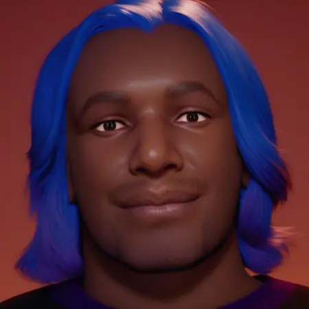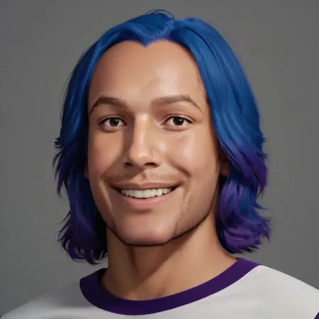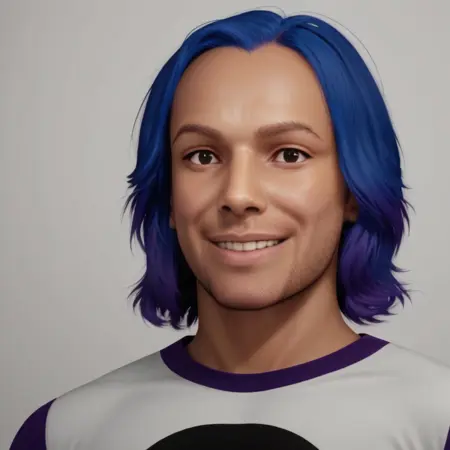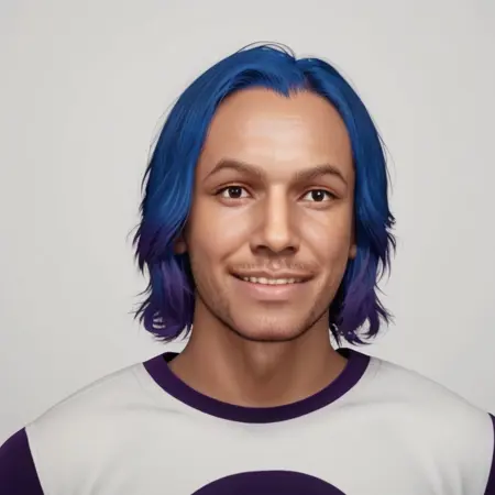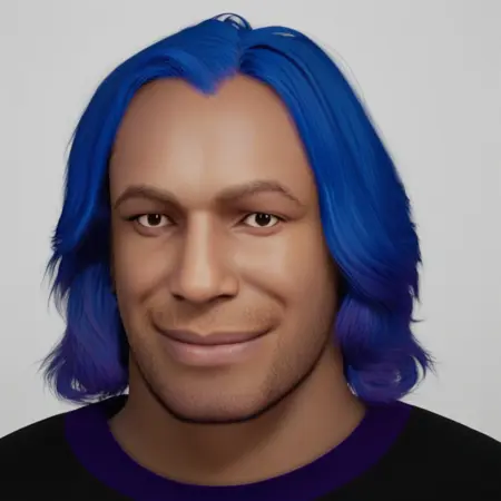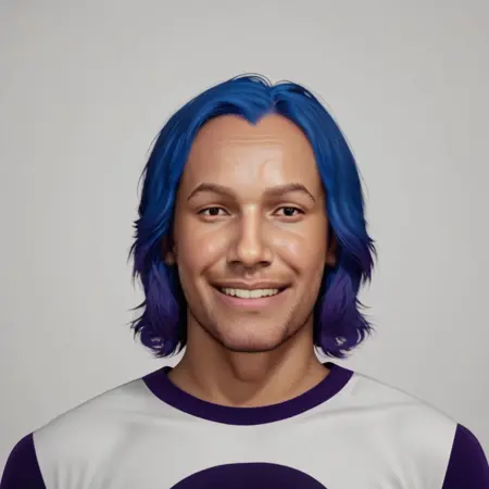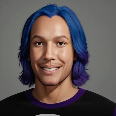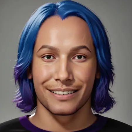criss metaxvoor, 1boy, male focus, solo, realistic, facial hair, black eyes, portrait, looking at viewer, red background, blue hair, shirt, simple background, dark-skinned male, closed mouth, smile, dark skin, beard, black shirt