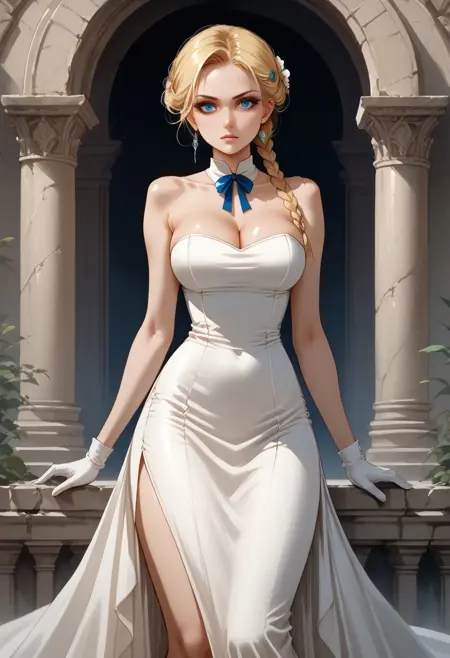 正式服装:formal dress, white dress, long dress, gloves, black thighhighs, bare shoulders, strapless dress, side slit, cleavage, neck ribbon, braid, side slit,
