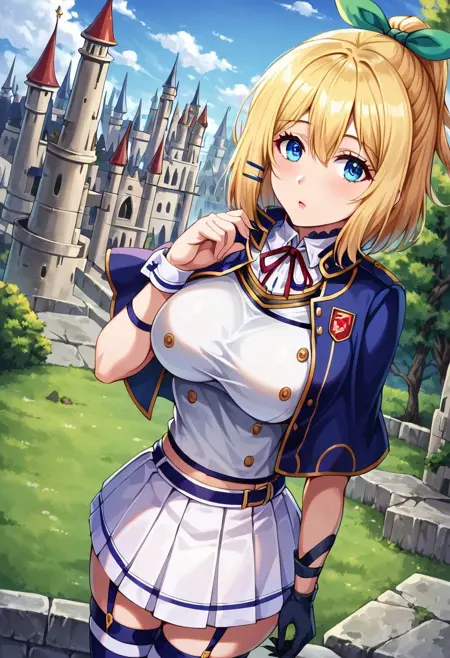 プロンプトアクティベーター:1girl, Rumia Tingel, \(Akashic Records of Bastard Magic Instructor\), blue eyes, blonde hair, medium hair, ponytail, hair clip, green ribbon,