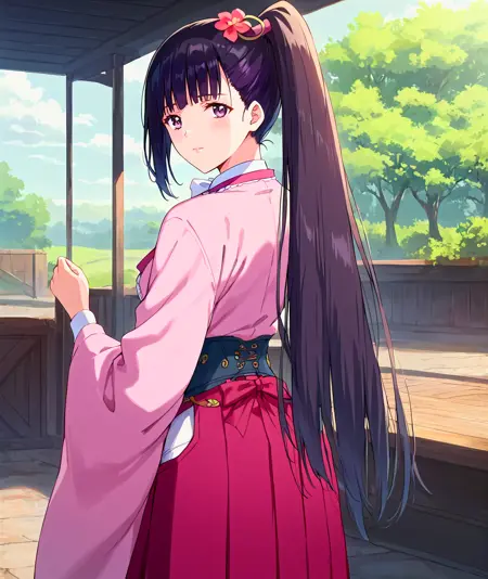 ayame, very long hair, high ponytail, bangs, black hair, purple eyes