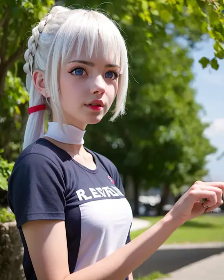 1girl, blue eyes,white hair, best quality, photo, 4k,looking at viewer,upper body,(wear t-shirt),