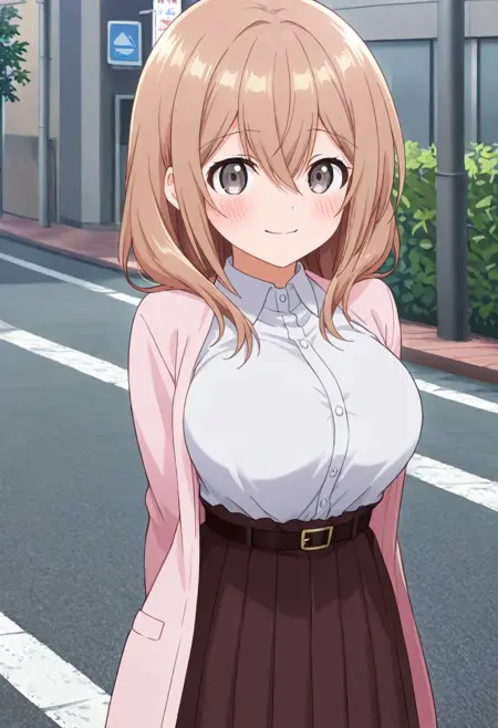 katase shiori, 棕色头发, 浅棕色头发, 中长发, 头发下可见眉毛, 侧发, 头发遮住眼睛, 棕色眼睛, 紫色眼睛, 大胸部, 粉色衬衫, 有领衬衫, 衬衫, 竖条纹衬衫, 棕色裙子, 高腰裙, 铅笔裙, 百褶裙, 皮带扣, 绿色腰带, 长袖, 飞翼领, 衬衫塞进裙子里, 扣子魔法少女 / 魔法少女