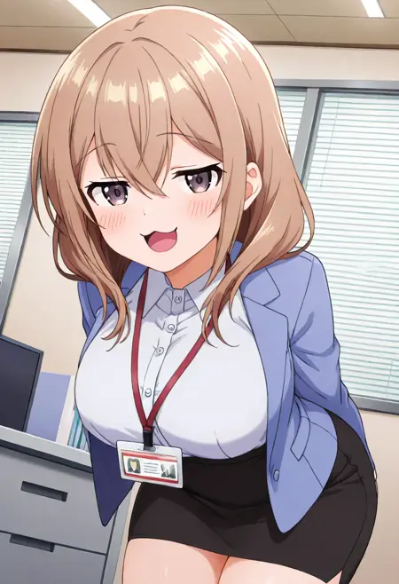 katase shiori, 棕色头发, 浅棕色头发, 中长发, 头发下可见眉毛, 侧发, 头发遮住眼睛, 棕色眼睛, 紫色眼睛, 大胸部, 西装裙装, 商务套装, 蓝色开衫, 白色衬衫, 有领衬衫, 衬衫, 飞翼领, 长袖, 铅笔裙, 黑色裙子, 扣子商务着装 2 / OL服 2