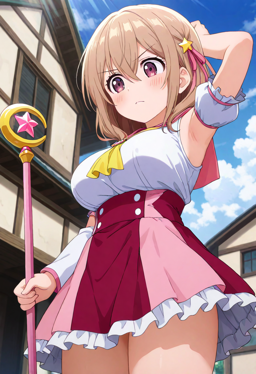 katase shiori, 棕色头发, 浅棕色头发, 中长发, 头发下可见眉毛, 侧发, 头发遮住眼睛, 棕色眼睛, 紫色眼睛, 魔法少女, 白色衬衫, 无袖衬衫, 蓬松短袖, 花边袖子, 可拆卸袖子, 白色袖子, 粉色水手领, 粉色裙子, 高腰裙, 背带裙, 百褶裙, 花边裙, 黄色领饰, 领结, 星形发饰, 头发丝带, 粉色丝带, 肩部露空设计