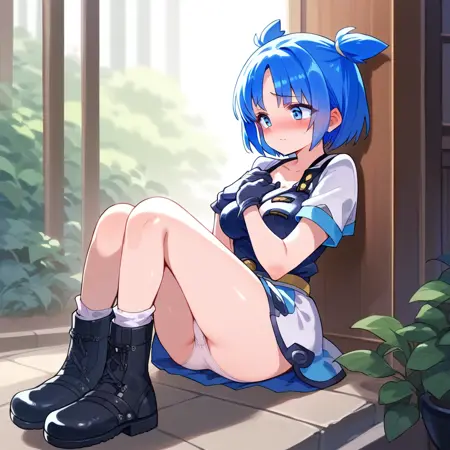 1girl, blue hair, blue eyes, gloves, short hair, solo, skirt, breasts, looking at viewer, twintails, boots