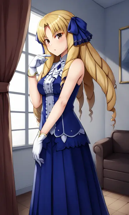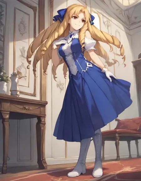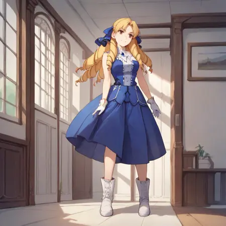 Luviagelita edelfelt, long hair, blonde hair, blue dress, drill hair, brown eyes, hair ribbon, white gloves, white boots,