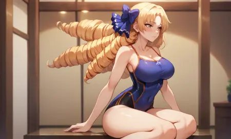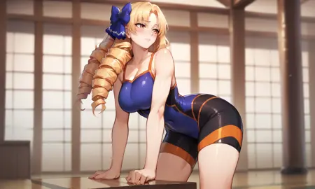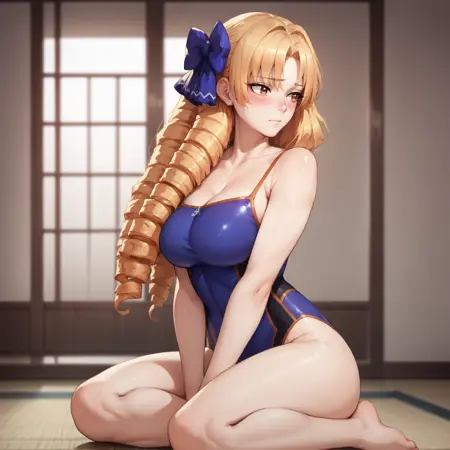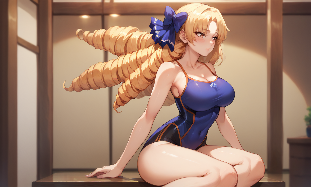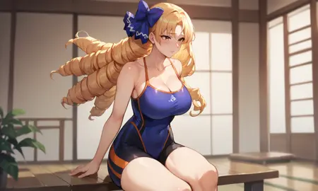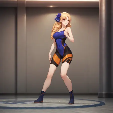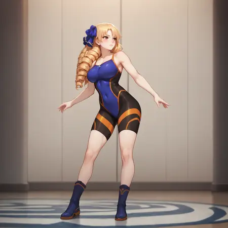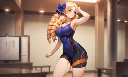 woman in some tight blue black orange body, 1girl, solo, large breasts, blonde hair, brown eyes, blush, drill hair, hair ribbon, bare legs, luviagelita_edelfelt,