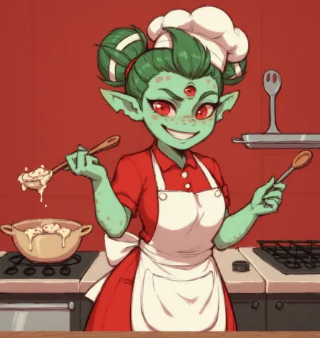 double bun, aylaan, short, 1girl, colored skin, pointy ears, green skin, green hair, hair bun, red eyes, freckles