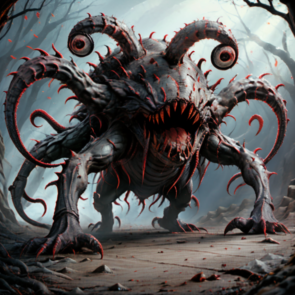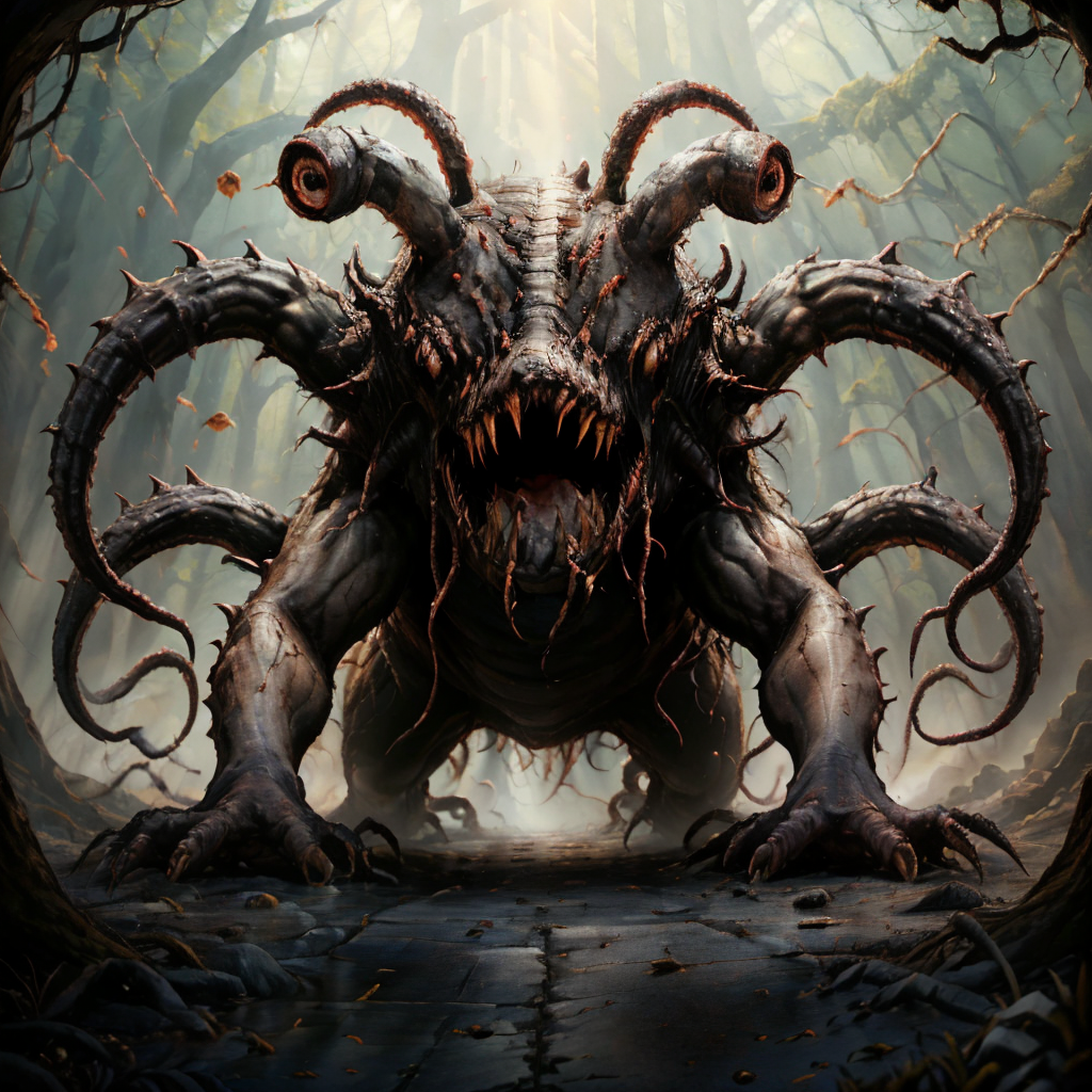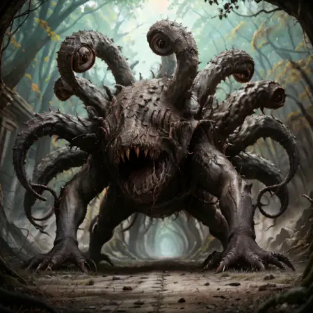 azgwad, bare tree, blurry, blurry background, building, city, claws, day, extra eyes, eye stalk, eyeball, eyestalk, faceless, forest, green eyes, horns, monster, nature, no humans, open mouth, outdoors, pillar, realistic, red eyes, rock, ruins, saliva, sharp teeth, sky, solo, spikes, standing, tail, teeth, tentacles, tree,