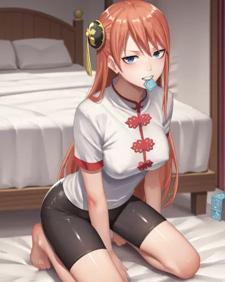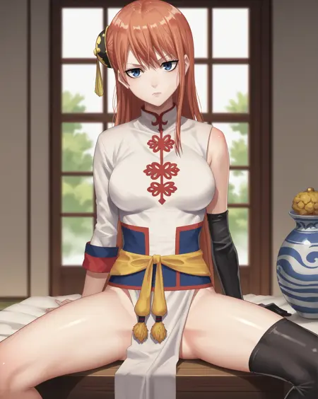 복장: 흰색 중국복, 비대칭 복장, 검은 장갑, 불균형 장갑, 검은 허벅지 긴 양말